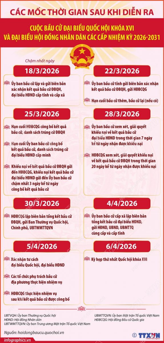 Các mốc thời gian Sau ngày Bầu cử ĐBQH khóa XVI, đại biểu HĐND các cấp nhiệm kỳ 2026-2031