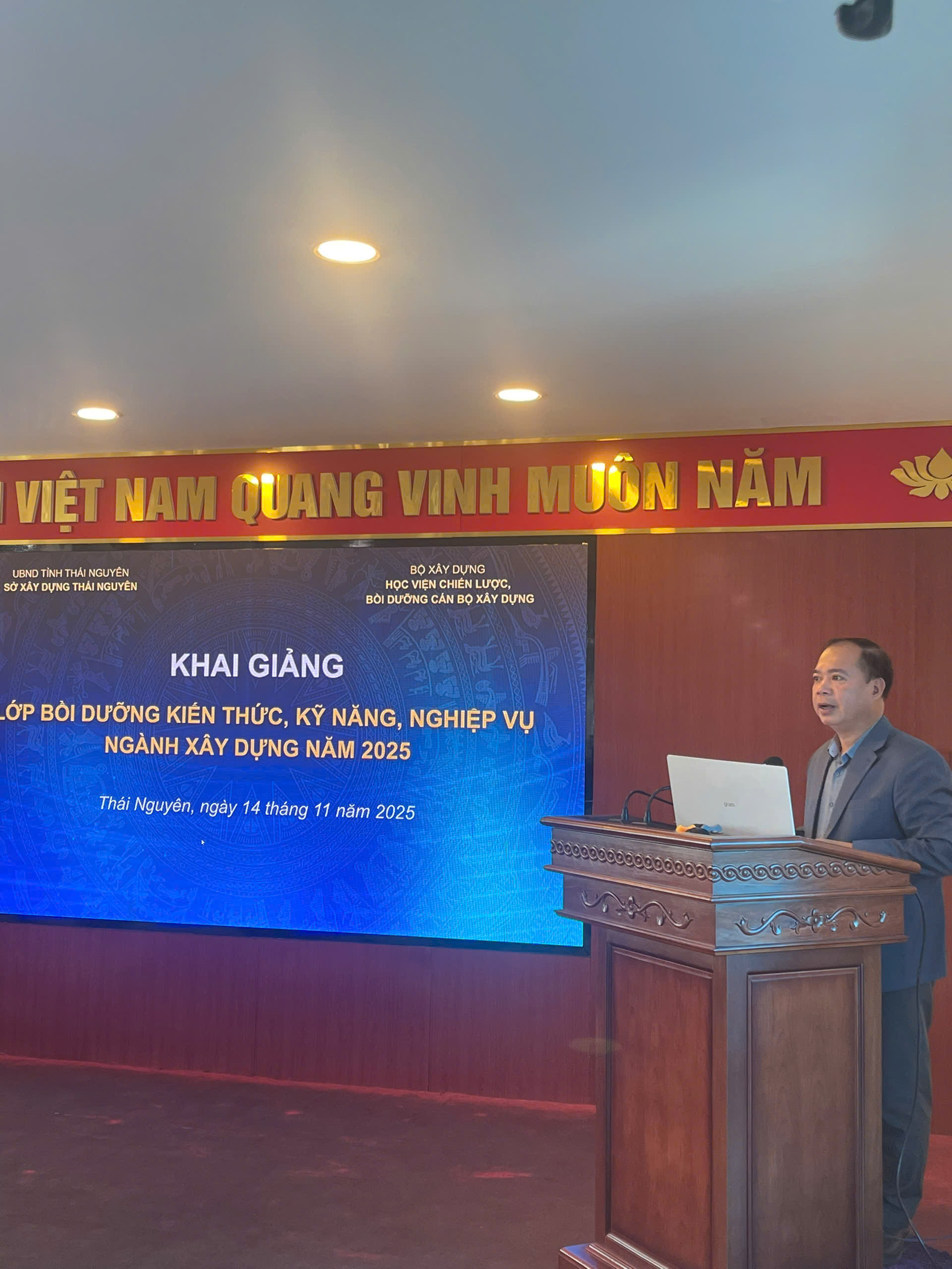Chính vì vậy, việc nâng cao năng lực cho đội ngũ cán bộ làm công tác liên quan đến lĩnh vực Xây dựng trở nên cấp thiết. Để nâng cao năng lực thực thi trong mô hình chính quyền hai cấp đạt hiệu quả cao, sáng ngày 14/11/2025, Học viện Chiến lược, Bồi dưỡng cán bộ xây dựng (Học viện/ACST) - Bộ Xây dựng phối hợp với Sở Xây dựng tỉnh Thái Nguyên tổ chức Lớp Bồi dưỡng kiến thức, kỹ năng, nghiệp vụ ngành Xây dựng năm 2025 tổ chức tại tỉnh Thái Nguyên dành cho các học viên là cán bộ, công chức, viên chức làm công tác quản lý xây dựng trên địa bàn tỉnh. Thông qua lớp học, các học viên sẽ cập nhật quy định về pháp luật mới, tăng cường năng lực quản lý và thực thi hiệu quả nhiệm vụ trong giai đoạn chuyển đổi số.