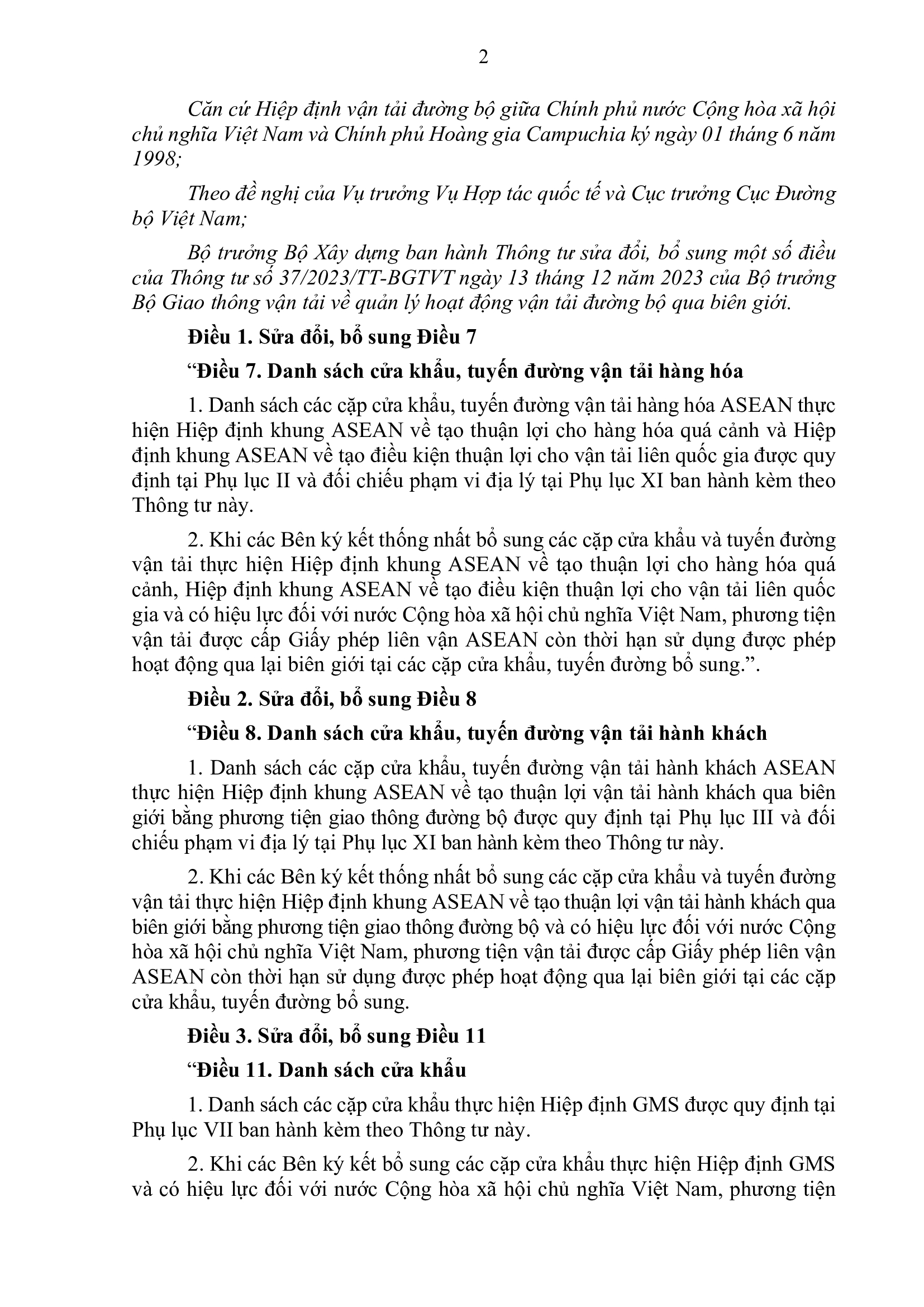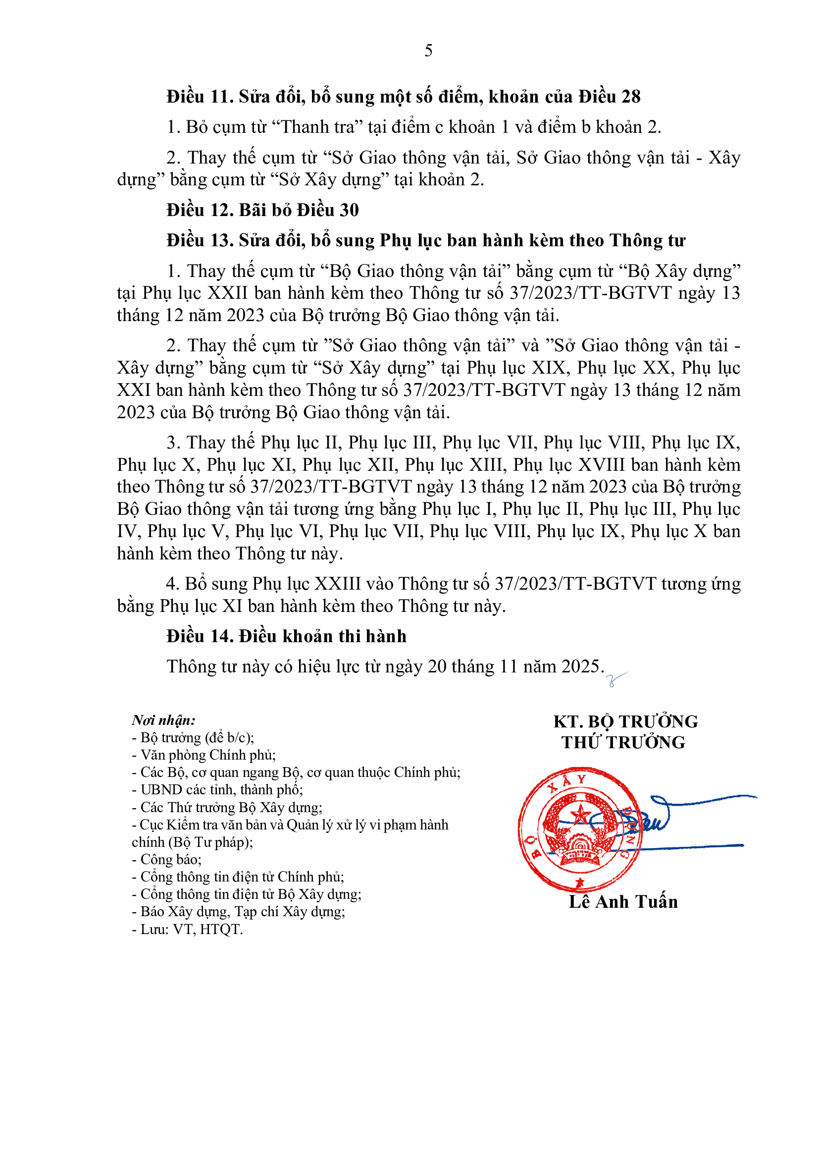 Bộ Xây dựng vừa ban hành Thông tư số 26/2025/TT-BXD ngày 30/9/2025 sửa đổi, bổ sung một số điều của Thông tư số 37/2023/TT-BGTVT ngày 13 tháng 12 năm 2023 của Bộ trưởng 02/10/2025 Lượt xem : 6 Bình luận : 0 Chia sẻ : Thêm bình luận mới Bình luận của bạn đã đợc gửi thành công. Cảm ơn bạn! Làm mới Lỗi. Vui lòng thử lại Gửi bình lun