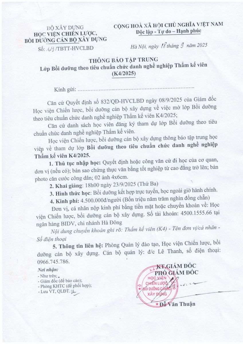 Bồi dưỡng theo tiêu chuẩn chức danh nghề nghiệp Thẩm kế viên K4-2025 18/09/2025 Lượt xem : 207 Bình luận : 0 Chia sẻ : Thêm bình luận mới Bình luận của bạn đã đợc gửi thành công. Cảm ơn bạn! Làm mới Lỗi. Vui lòng thử lại Gửi bình lun