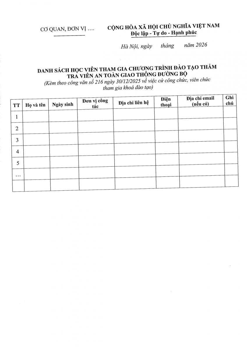 Đăng kí ONLINE đào tạo Thẩm tra viên ATGT khai giảng ngày 10/01/2025 05/01/2026 Lượt xem : 152 Bình luận : 0 Chia sẻ : Tải xuống Tệp đnh kèm Thêm bình luận mới Bình luận của bạn đã đợc gửi thành công. Cảm ơn bạn! Làm mới Lỗi. Vui lòng thử lại Gửi bình luận