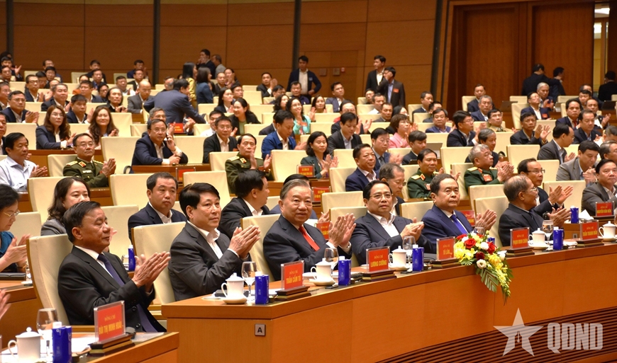 Tổng Bí thư Tô Lâm cùng các đồng chí lãnh đạo, nguyên lãnh đạo Đảng, Nhà nước và các đại biểu dự hội nghị. Ảnh: Báo Quân đội nhân dân.