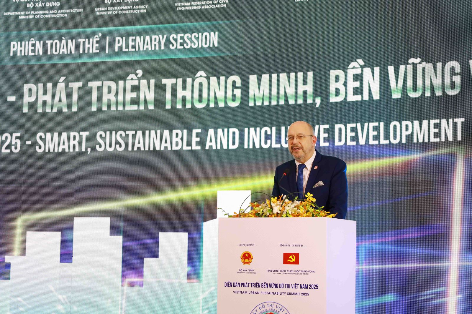 Phát biểu khai mạc Diễn đàn, Thứ trưởng Bộ Xây dựng Nguyễn Tường Văn cho biết, năm 2025 là thời điểm có ý nghĩa đặc biệt quan trọng, đánh dấu nhiều sự kiện lớn của đất nước, trong đó công tác phát triển đô thị bước sang giai đoạn đổi mới toàn diện với việc triển khai mô hình chính quyền địa phương 2 cấp, một chủ trương lớn, tạo bước ngoặt trong quản trị và phát triển đô thị Việt Nam. Năm 2025 cũng tròn 10 năm kể từ khi Việt Nam cùng cộng đồng quốc tế cam kết thực hiện mục tiêu số 11 về phát triển đô thị bền vững trong 17 mục tiêu Phát triển bền vững của Liên hợp quốc (SDGs).