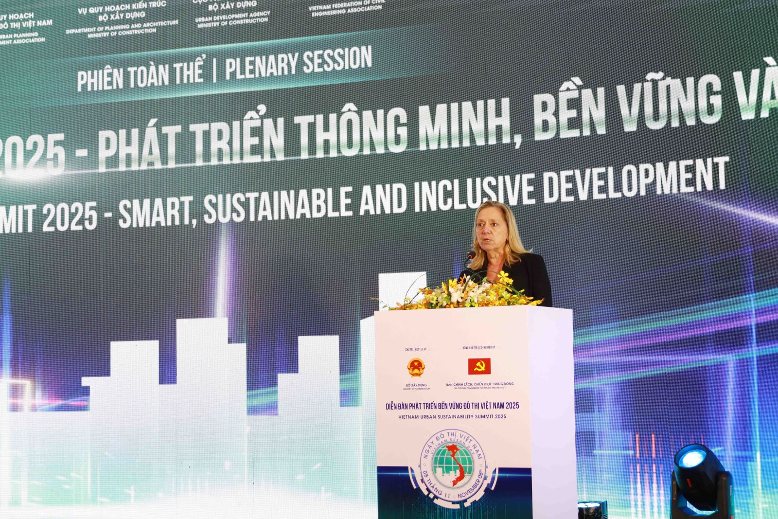 Cũng tại Diễn đàn, bà Mariam J. Sherman - Giám đốc Quốc gia Ngân hàng Thế giới (WB) tại Việt Nam, Campuchia và Lào chia sẻ, Việt Nam đang đứng trước cơ hội lớn để chuyển mình trở thành quốc gia có hệ thống đô thị năng động, thông minh và thân thiện với môi trường. WB cam kết tiếp tục hợp tác chặt chẽ với Chính phủ Việt Nam trong các lĩnh vực trọng điểm như quy hoạch tích hợp, tài chính đô thị, phát triển hạ tầng bền vững và chuyển đổi xanh. Bà nhấn mạnh: “Đô thị bền vững không chỉ là đích đến, mà là hành trình đòi hỏi tầm nhìn dài hạn, sự lãnh đạo mạnh mẽ và cam kết phối hợp liên ngành. Việt Nam đã có nền tảng tốt và WB sẵn sàng đồng hành trên con đường đó.”.