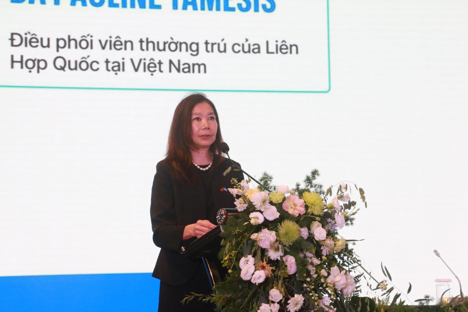 Bà Pauline Tamesis - Điều phối viên thường trú của Liên Hợp Quốc tại Việt Nam, phát biểu về tầm nhìn toàn cầu trong phát triển đô thị bền vững và những bài học rút ra từ dự án ISCB.
