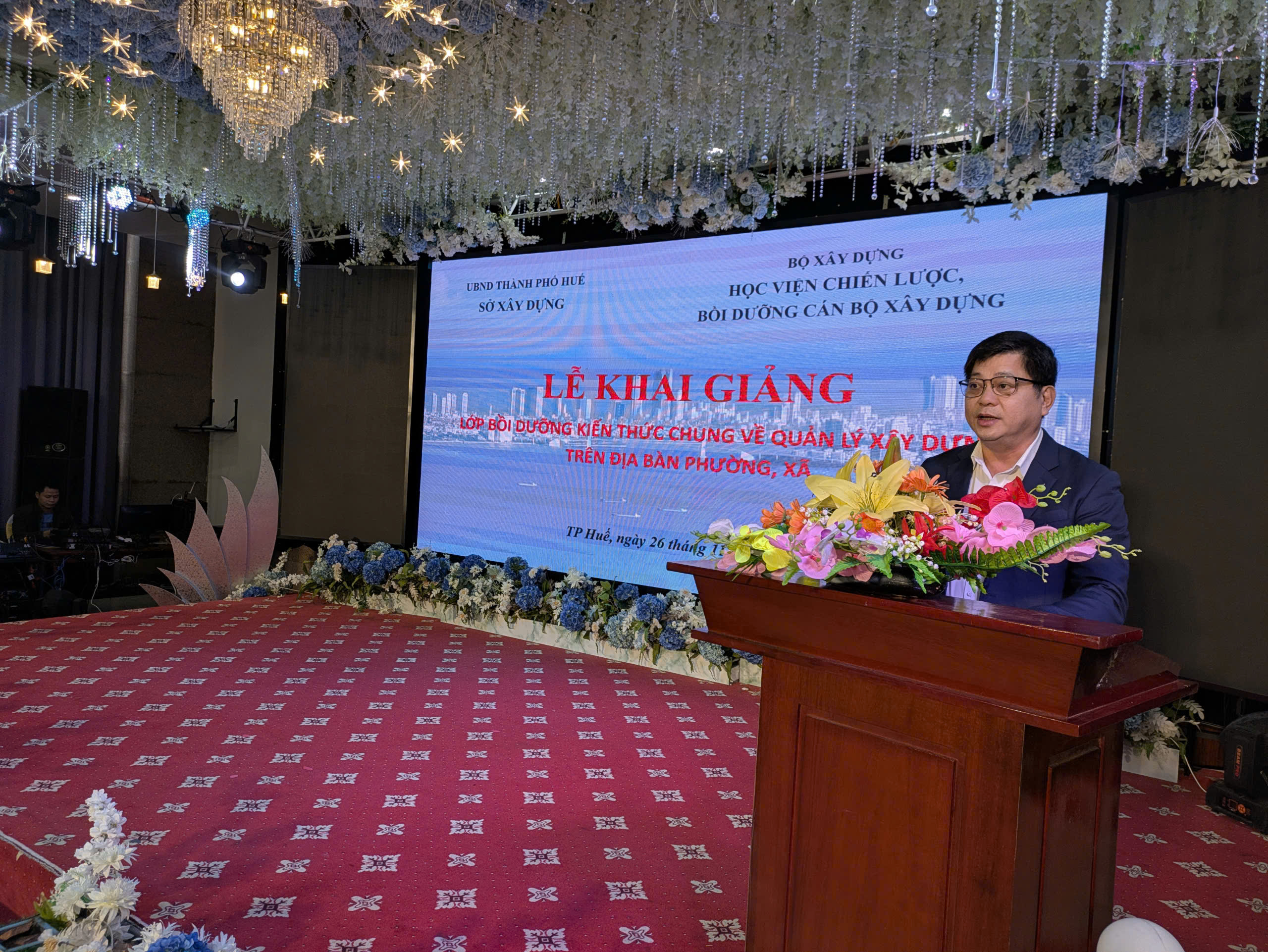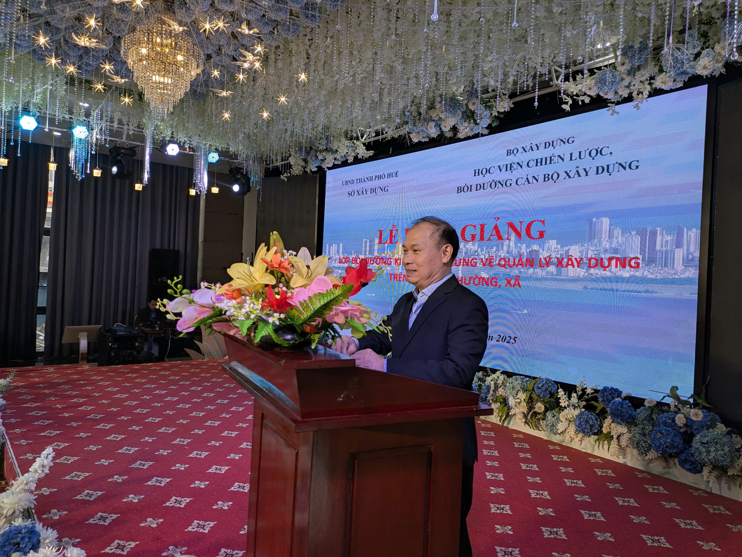 Tham dự khai giảng lớp học về phía sở Xây dựng Thành phố Huế có ông Lê Toàn Thắng - Phó Giám đốc Sở Xây dựng Thành phố Huế; về phía Học viện Chiến lược, bồi dưỡng cán bộ xây dựng có TS,GVCC.Phạm Văn Bộ - Phó Giám đốc Học viện và đông đủ 141 học viên là cán bộ lãnh đạo, công chức chuyên môn đến từ các xã, phường và một số phòng ban trực thuộc Sở Xây dựng trên địa bàn Thành phố Huế.