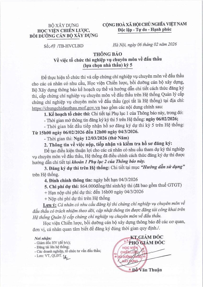 Tổ chức thi nghiệp vụ chuyên môn về đấu thầu kỳ 5 ngày 12/03/2026 07/02/2026 Lượt xem : 31 Bình luận : 0 Chia sẻ : Đang cập nhật... Tải xuống Tệp đnh kèm Thêm bình luận mới Bình luận của bạn đã đợc gửi thành công. Cảm ơn bạn! Làm mới Lỗi. Vui lòng thử lại Gửi bình luận