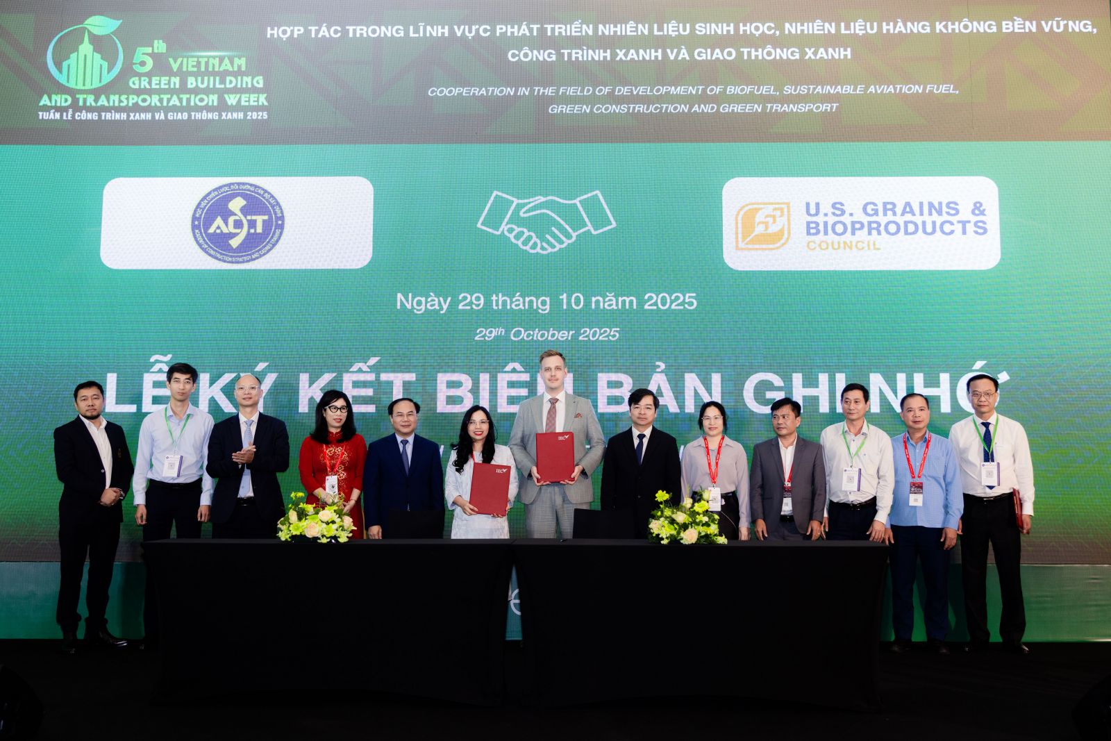 ảnh10: Ký kết Biên bản ghi nhớ giữa Học viện Chiến lược, bồi dưỡng cán bộ xây dựng và Hiệp hội Ngũ cốc và Sinh phẩm Hoa Kỳ (USGBC) về hợp tác trong lĩnh vực phát triển nhiên liệu sinh học, nhiên liệu hàng không bền vững, công trình xanh và giao thông xanh