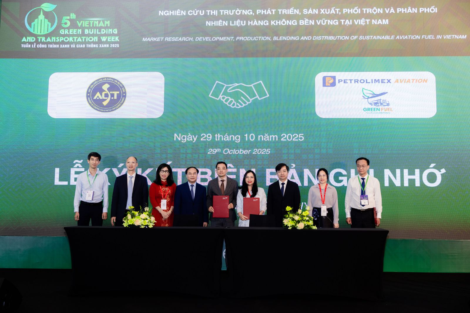 ảnh 11: Ký kết Biên bản ghi nhớ giữa Học viện Chiến lược, bồi dưỡng cán bộ xây dựng và Công ty Cổ phần Nhiên liệu bay Petrolimex trong việc nghiên cứu thị trường, phát triển, sản xuất, phối trộn và phân phối nhiên liệu hàng không bền vững tại Việt Nam