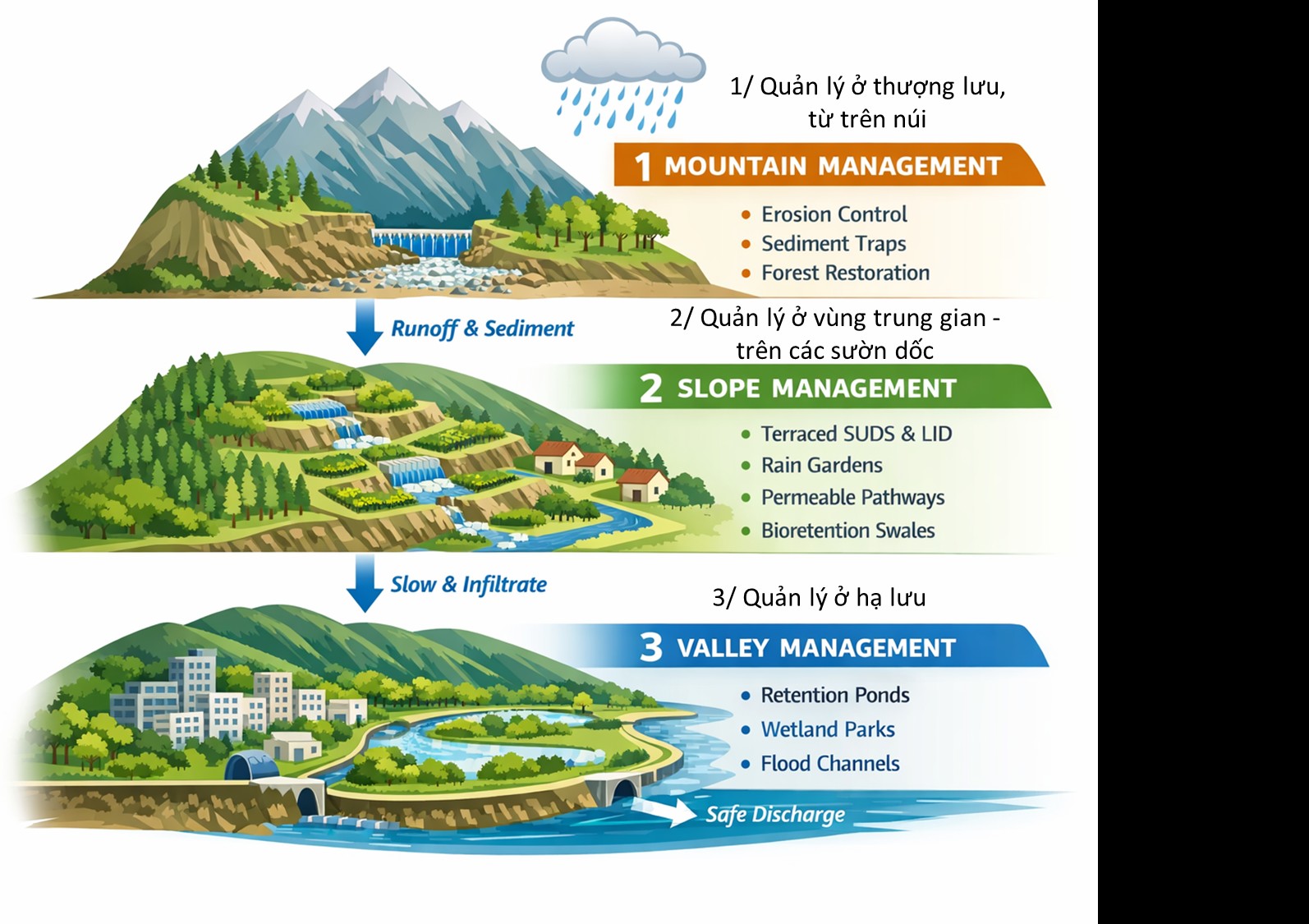 Trong đó, quản lý thượng lưu đóng vai trò nền tảng nhằm kiểm soát nguồn phát sinh dòng chảy; các giải pháp LID giúp phân tán và làm chậm dòng chảy trong khu vực sườn dốc; hạ tầng tích hợp blue–green–grey–smart hỗ trợ điều tiết và kiểm soát dòng chảy trong khu vực đô thị; bảo vệ hành lang sông giúp duy trì khả năng thoát lũ tự nhiên; quy hoạch thích ứng rủi ro góp phần hạn chế phát triển tại các khu vực dễ bị tổn thương; và cơ chế quản lý – tài chính đảm bảo tính khả thi và bền vững trong quá trình triển khai.