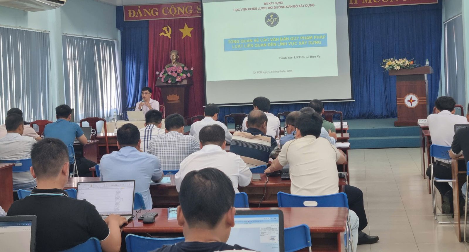Toàn cảnh khai giảng khoá Bồi dưỡng nghiệp vụ giám sát thi công xây dựng công trình K1 năm 2026 tại TP. Hồ Chí Minh do Học viện Chiến lược, bồi dưỡng cán bộ xây dựng (Bộ Xây dựng) tổ chức.