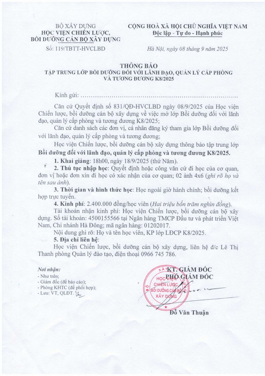 Bồi dưỡng đối với lãnh đạo, quản lý cấp phòng và tương đương K8 - 2025 18/09/2025 Lượt xem : 760 Bình luận : 0 Chia sẻ : Thêm bình luận mới Bình luận của bạn đã đợc gửi thành công. Cảm ơn bạn! Làm mới Lỗi. Vui lòng thử lại Gửi bình luận