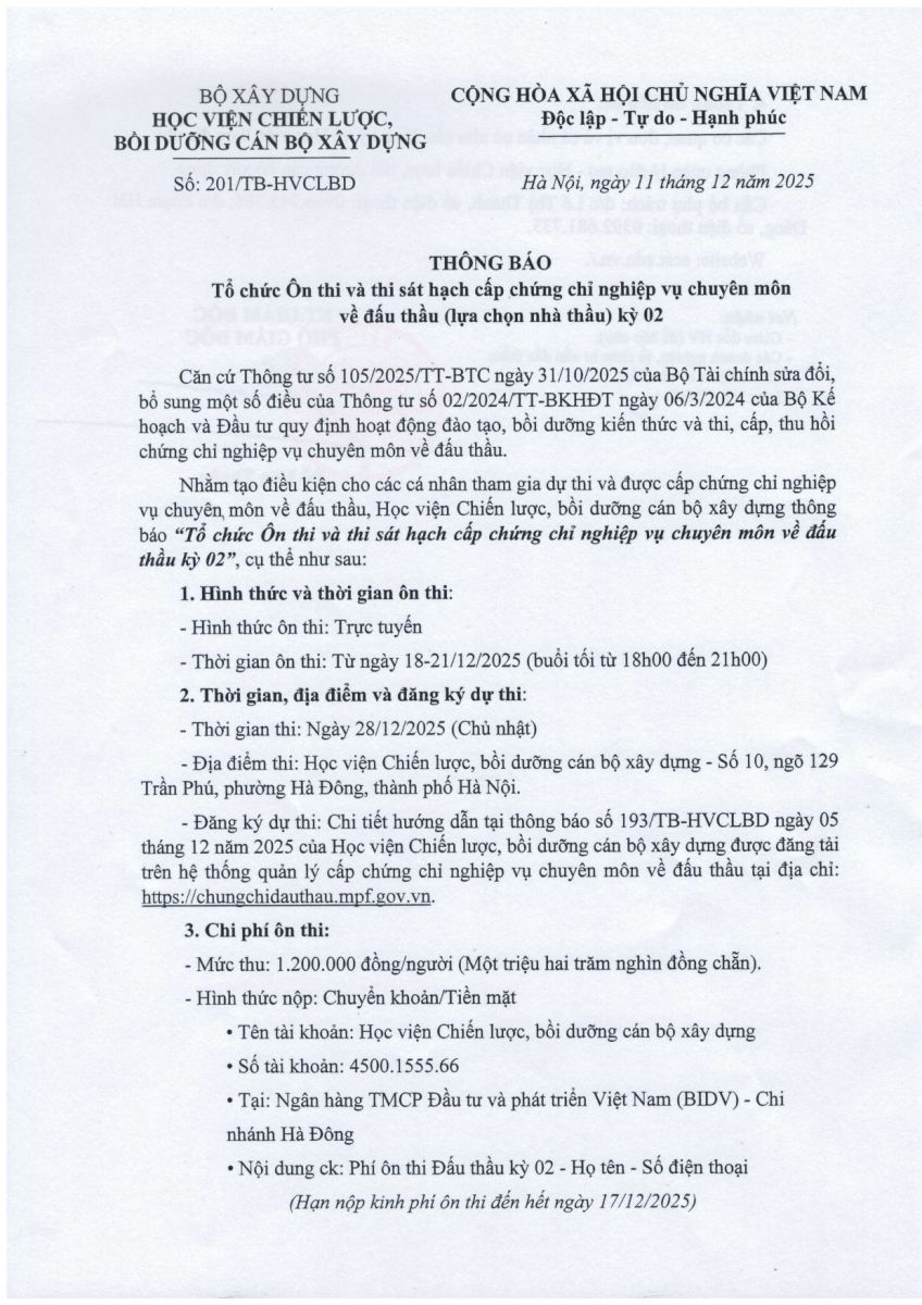 Đăng kí ôn thi và thi nghiệp vụ chuyên môn về đấu thầu (kỳ 2) 14/12/2025 Lượt xem : 18 Bình luận : 0 Chia sẻ : Tải xuống Tệp đnh kèm Thêm bình luận mới Bình luận của bạn đã đợc gửi thành công. Cảm ơn bạn! Làm mới Lỗi. Vui lòng thử lại Gửi bình luận