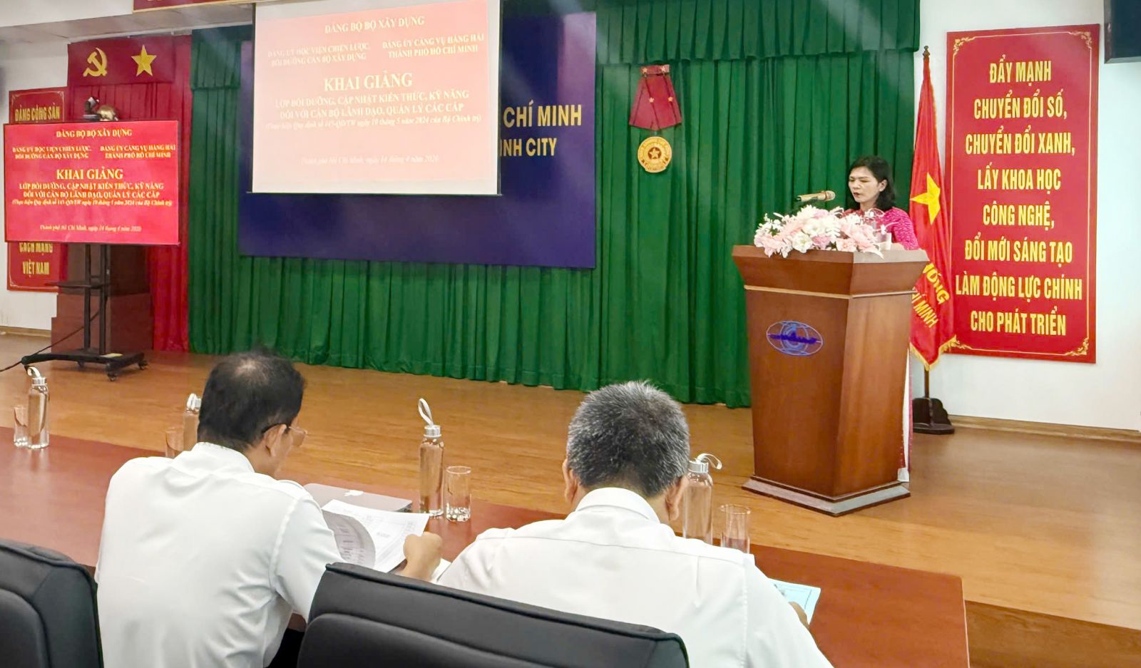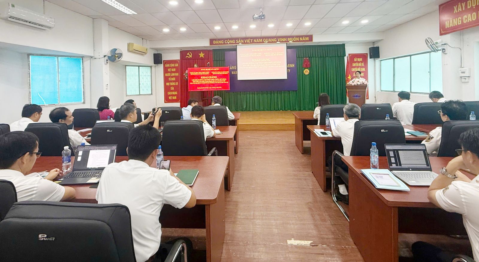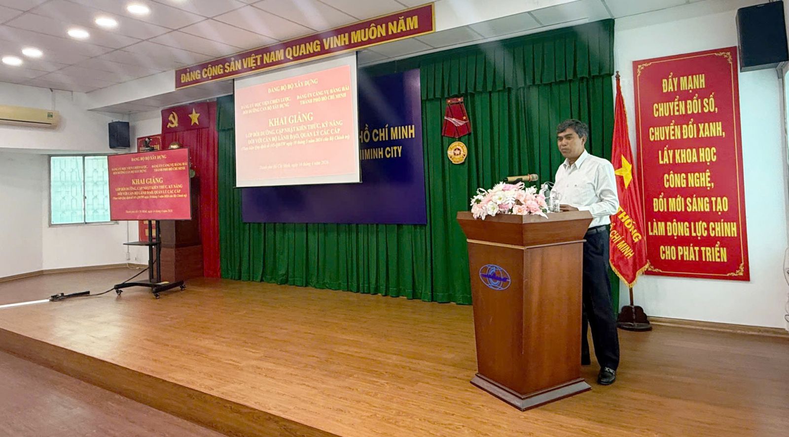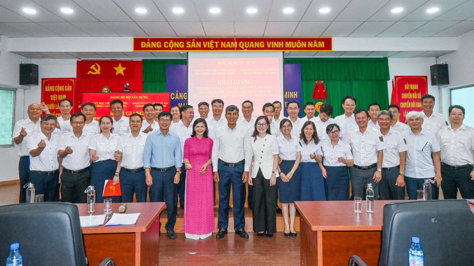 Nhằm cụ thể hóa chủ trương của Đảng về nâng cao chất lượng đội ngũ cán bộ lãnh đạo, quản lý trong giai đoạn mới, ngày 14/4/2026, Đảng ủy Học viện Chiến lược, bồi dưỡng cán bộ xây dựng (Học viện/ACST) phối hợp với Đảng ủy Cảng vụ Hàng hải Thành phố Hồ Chí Minh long trọng tổ chức khai giảng “Lớp bồi dưỡng, cập nhật kiến thức, kỹ năng đối với cán bộ lãnh đạo, quản lý các cấp theo Quy định số 145-QĐ/TW của Bộ Chính trị” tại Hội trường Cảng vụ Hàng hải Thành Phố Hồ Chí Minh. Lớp học có sự tham gia của 40 học viên học trực tiếp và còn có các cán bộ thuộc diện cấp uỷ, tổ chức đảng, lãnh đạo cơ quan, đơn vị trong Đảng bộ Cảng vụ Hàng hải thành phố Hồ Chí Minh tham dự lớp học theo hình thức học trực tuyến.