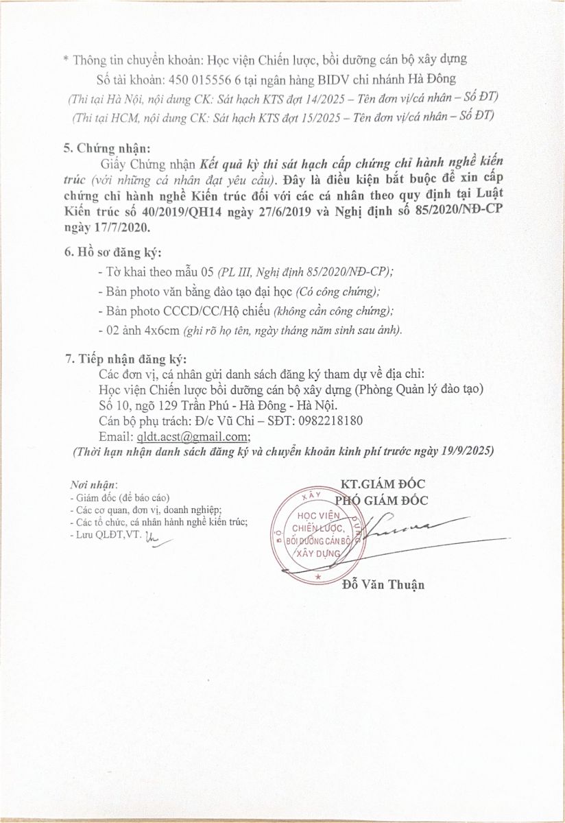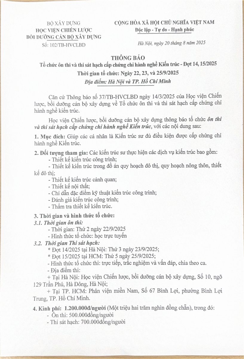 Thi sát hạch hành nghề Kiến trúc đợt 14-15 tại Hà Nội và TP. Hồ Chí Minh 09/09/2025 Lượt xem : 556 Bình luận : 0 Chia sẻ : Thêm bình luận mới Bình luận của bạn đã đợc gửi thành công. Cảm ơn bạn! Làm mới Lỗi. Vui lòng thử lại Gửi bình luận