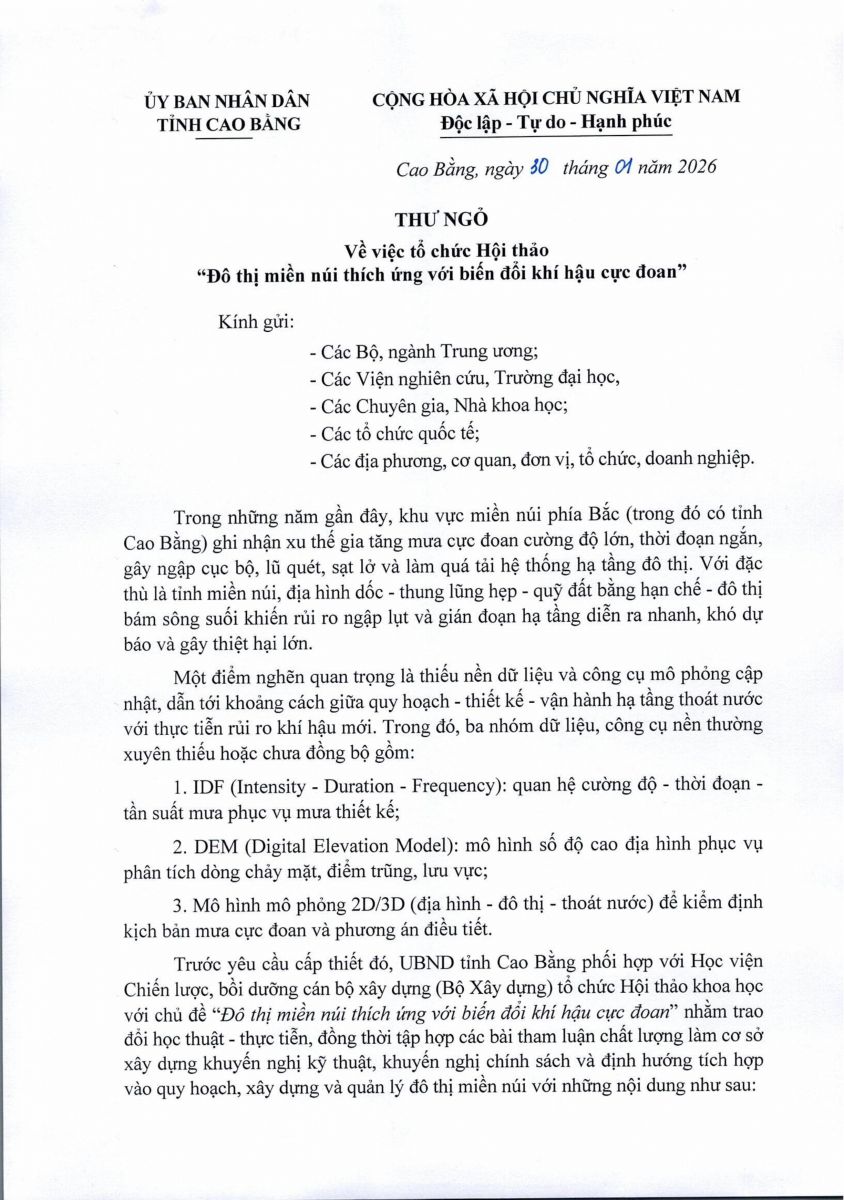Thư ngỏ về việc Tổ chức Hội thảo Đô thị miền núi thích ứng với biến đổi khí hậu cực đoan 03/03/2026 Lượt xem : 5 Bình luận : 0 Chia sẻ : Thêm bình luận mới Bình luận của bạn đã đợc gửi thành công. Cảm ơn bạn! Làm mới Lỗi. Vui lòng thử lại Gửi bình luận