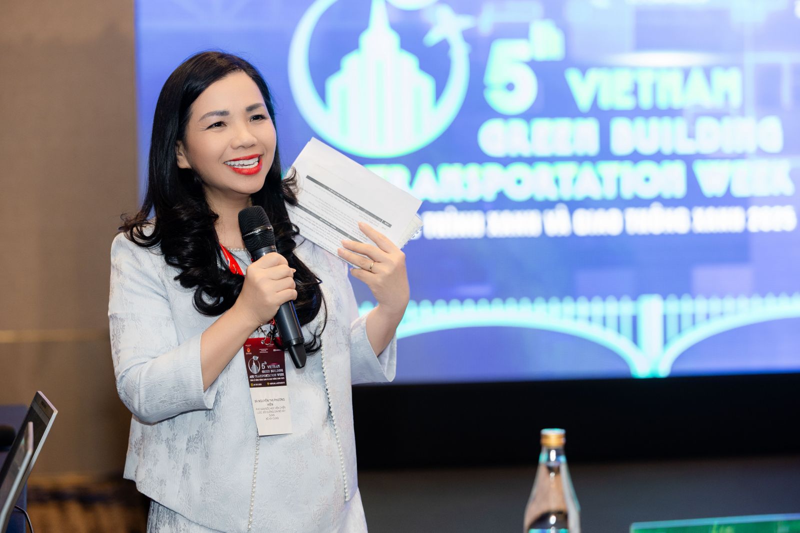 ảnh 6: Bà Nguyễn Thị Phương Hiền, Phó Giám đốc Học viện Chiến lược, bồi dưỡng cán bộ xây dựng phát biểu tại Phiên thảo luận với chủ đề “Từ chính sách đến hành động: Hợp tác đa phương thúc đẩy chuyển đổi xanh trong giao thông vận tải”