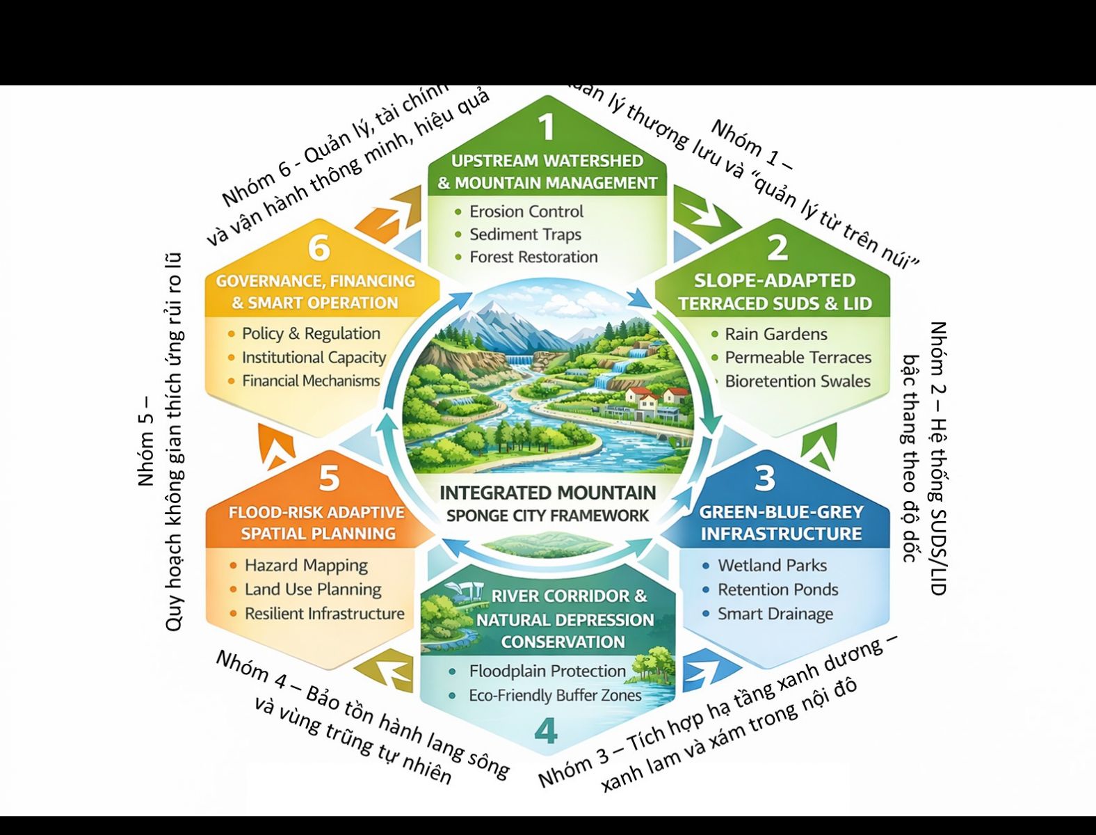 Trong đó, quản lý thượng lưu đóng vai trò nền tảng nhằm kiểm soát nguồn phát sinh dòng chảy; các giải pháp LID giúp phân tán và làm chậm dòng chảy trong khu vực sườn dốc; hạ tầng tích hợp blue–green–grey–smart hỗ trợ điều tiết và kiểm soát dòng chảy trong khu vực đô thị; bảo vệ hành lang sông giúp duy trì khả năng thoát lũ tự nhiên; quy hoạch thích ứng rủi ro góp phần hạn chế phát triển tại các khu vực dễ bị tổn thương; và cơ chế quản lý – tài chính đảm bảo tính khả thi và bền vững trong quá trình triển khai.
