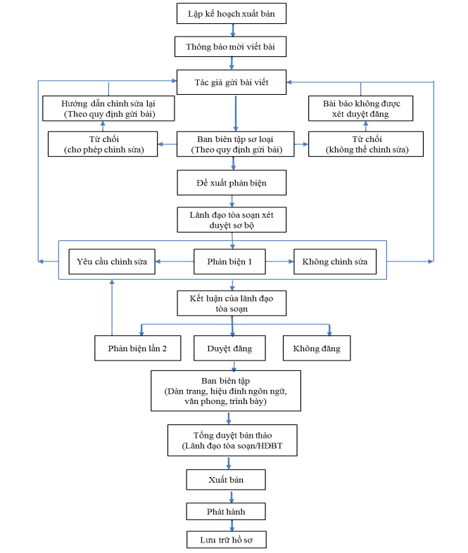 Bài báo sau khi được lãnh đạo tòa soạn duyệt đăng, Thư ký tòa soạn sẽ chuyển bài báo sang bộ phận biên tập để hiệu đính nội dung, ngôn ngữ, văn phong, trình bày, định dạng. Trong quá trình biên tập xuất bản, biên tập viên có thể liên hệ với tác giả để hỗ trợ hiệu chỉnh chính xác nội dung.
