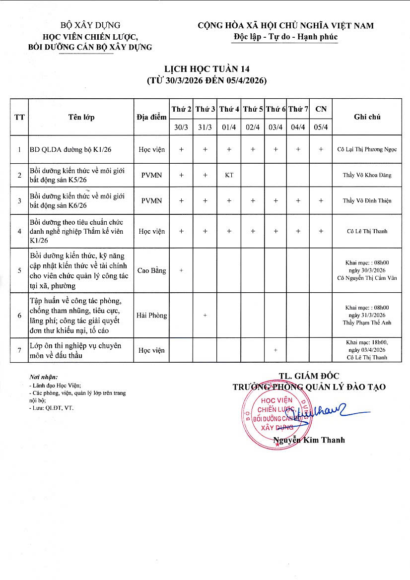 Lịch học tuần 14 từ 30/3/2026 đến 05/4/2026 27/03/2026 Lượt xem : 4 Bình luận : 0 Chia sẻ : Đang cập nhật... Thêm bình luận mới Bình luận của bạn đã đợc gửi thành công. Cảm ơn bạn! Làm mới Lỗi. Vui lòng thử lại Gửi bình luận